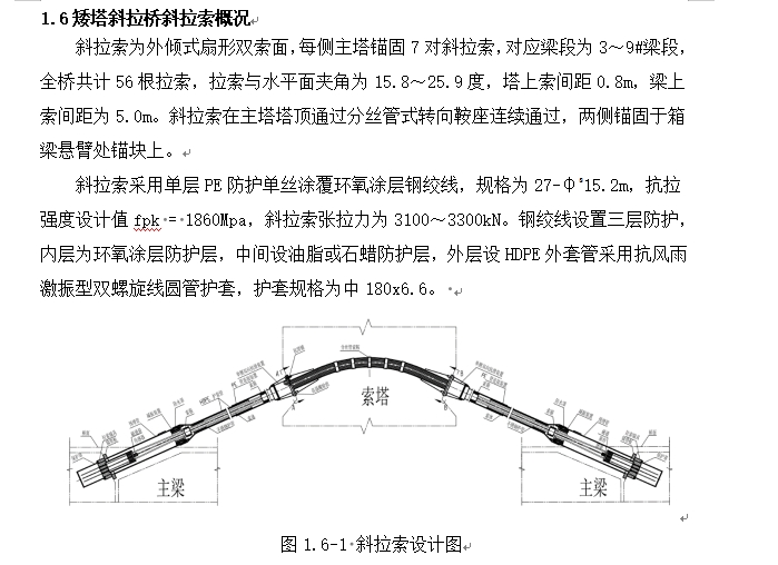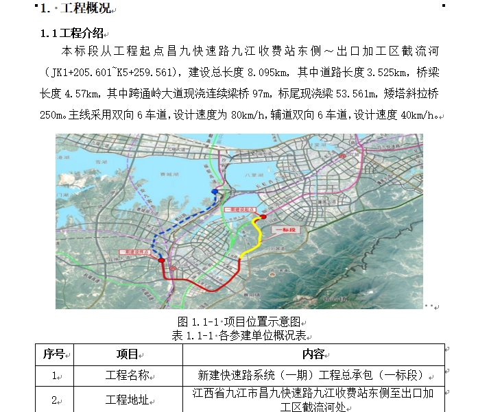 斜拉桥安全专项工程投标文件技术标含图纸,本标段从工程起点昌九快速路九江收费站东侧~出口加工区截流河(JK1+205.601~K5+259.561),建设总长度8.095km,其中道路长度3.525km,桥梁长度 4.57km,其中跨通岭大道现浇连续梁桥 97m,标尾现浇梁 53.561m,矮塔斜拉桥250m。主线采用双向6车道,设计速度为 80km/h,辅道双向6车道,设计速度 40km/h。