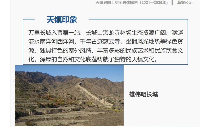 天镇县国土空间规划编制目的:推动区域协调发展,加强与周边市县互联互通,加强新型基础设施网络建设,引导城镇、产业与交通一体化布局,促进城乡协调发展,提升国土空间发展力。