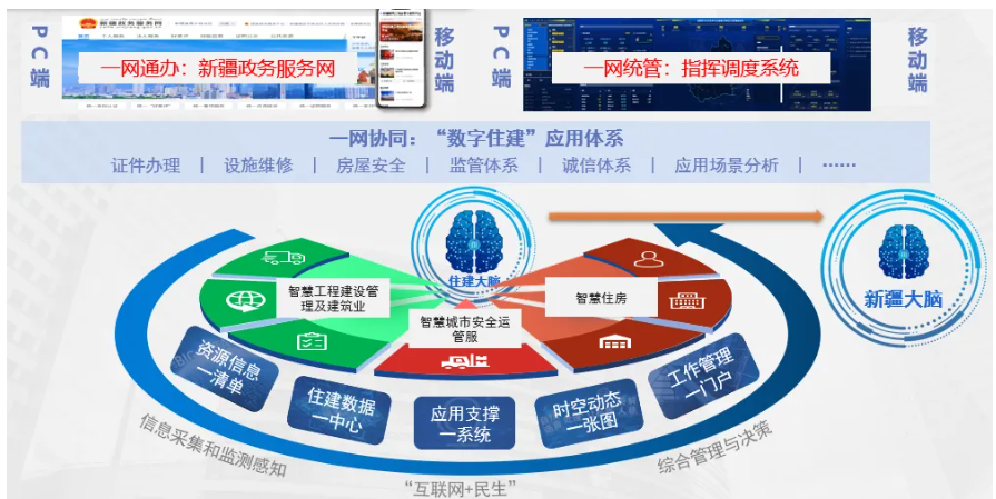 “三个辅助服务体系”涵盖住建信息采集与检测感知、综合管理与决策、互联网 + 民生服务等三大方面,为智慧住建提供一体化支撑服务、空间信息动态监测与集成、资源全流程管理、信息保障、指挥调度、应急管理、信用管理、协同办公、一网通办、企业服务等提供服务支撑。新疆维吾尔自治区住房城乡建设厅数字政府建设在各业务应用系统正常运行的基础上,整合智慧工程建设管理及建筑业、智慧城市安全运管服、智慧住房三大应用体系,实现“一网通办”“一网统管”“一网协同”,完成“新疆住建大脑”的构建,最终实现和“新疆大脑”的互联互通。