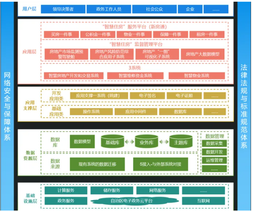 自治区住建领域业务信息化方面已建成全区住房和城乡建设领域政务信息系统 37 套,包括厅级应用和部级垂直应用系统,实现住建领域主要信息化业务工作全覆盖。基于四库一平台能实现自治区、地(州、市)、县(市、区)三级平台业务联动,实现企业人员、项目数据共享,初步形成“智慧住建”基础体系。